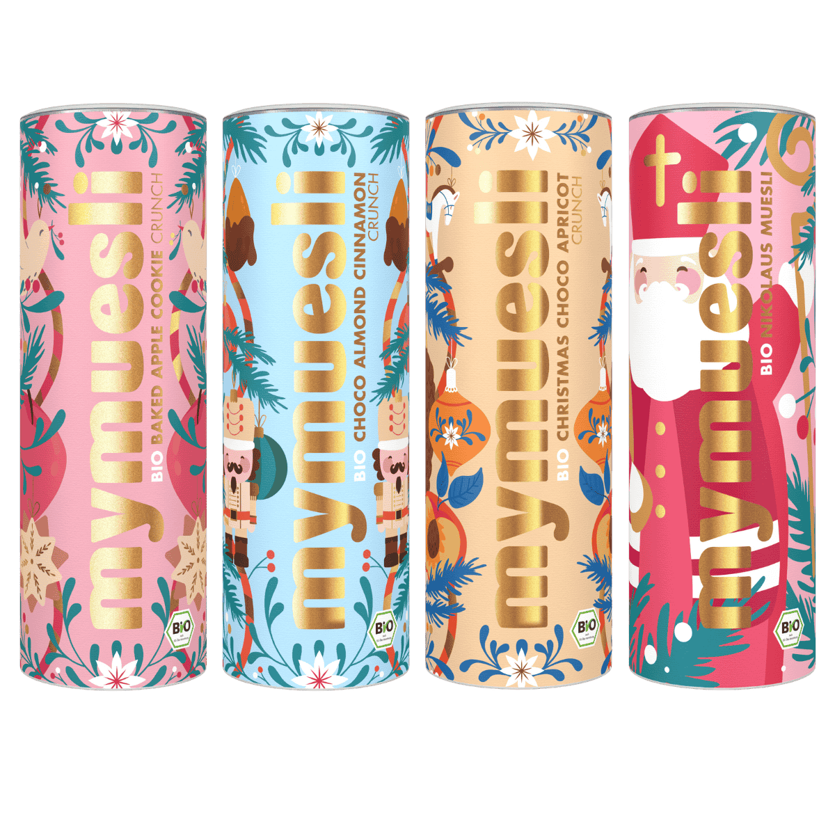 Vier Müeslis, ein Fest: Das Christmas Crunch Bundle vereint vier festliche Bio-Müeslis voller winterlicher Aromen.