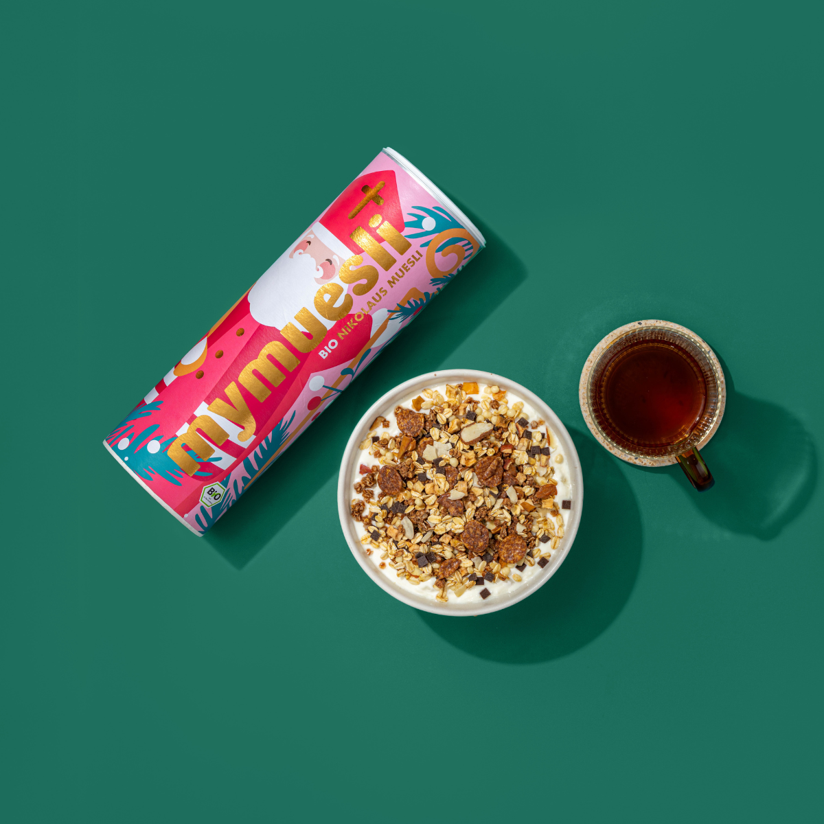 Haferflocken, Haferknusperstückchen mit Lebkuchengewürz (32%) (Hafervollkornflocken, Rohrzucker, Sonnenblumenöl, Reissirup, Reismehl, Kakaopulver, Kakaomasse, Gerstenmalzmehl, Kokosraspeln, Meersalz*, Kakaobutter, Zimt, gemahlener Anis, Nelken, Koriander, Kardamom), Schokoladen-Cornflakes (Mais, Rohrohrzucker, Kakaobutter, Kakaomasse, Reissirup, Überzugsmittel: Gummi arabicum, Meersalz*), Zartbitter-Schokolade (6%) (Kakaomasse, Rohrzucker, Kakaobutter), getrocknete Apfelstücke (6%), Mandeln (4%), knusprige Dinkelbällchen mit weißer Kakaofettglasur (Zucker, Kakaobutter, Reissiruppulver, Maisgrieß, Dinkelweizenvollkornmehl, Überzugsmittel: Gummi arabicum, natürliches Vanillearoma, Meersalz*, Emulgator: Sonnenblumenlecithine).
