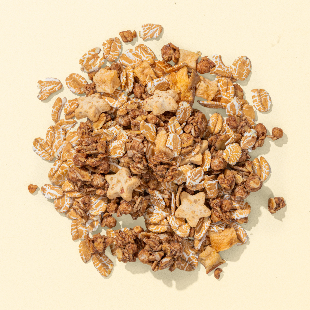 crunchy croquants de granola avec des épices* (45%) (farine d'avoine complète*, sucre de canne*, huile de tournesol*, sirop de riz*, farine de riz*, cacao en poudre*, pâte de cacao*, farine de malt d’orge*, noix de coco déshydratée*, sel de mer, beurre de cacao*, cannelle*, anis moulu*, clous de girofle*, coriandre*, cardamome*), flocons blé d'épeautre*, biscuits aux pommes cuites au four aux épices* (6%) (farine de blé*, sucre de canne brut*, huile de tournesol*, amidon de blé*, poudre de pomme*, raisins secs hachés*, mélasse de canne à sucre*, mélange d'épices* (sucre de canne complet*, sucre de fleur de